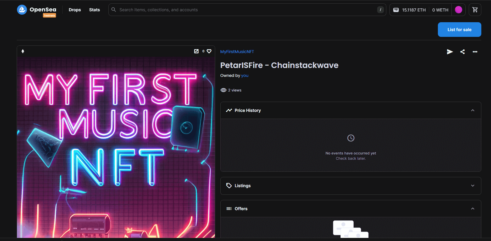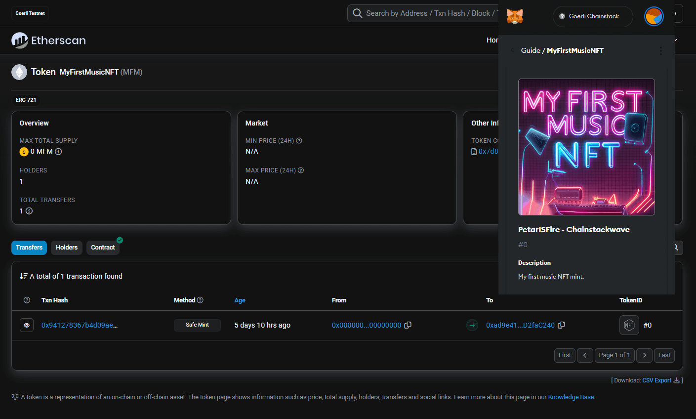 Etherscan Unfortunately, MetaMask does not permit you to play the audio associated with your music NFT. To accomplish this, visit OpenSea, specifically the Sepolia Testnet version found here. Use MetaMask to log in, and once successful, hover over your avatar and click Profile. You should see your music NFT; click on it to reveal its details. If the featured image only shows a small preview, click on it once more and then a third time to open it in full screen, so your tune starts playing.